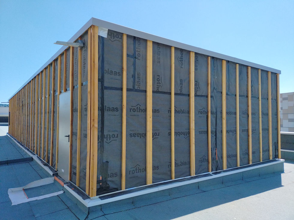 Bardage de l'édicule et contre-bardage des acrotères en panneaux ETERNIT en sous-traitance pour l'entreprise SUCHEYRE.