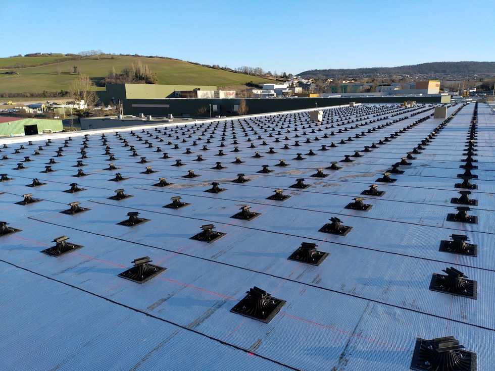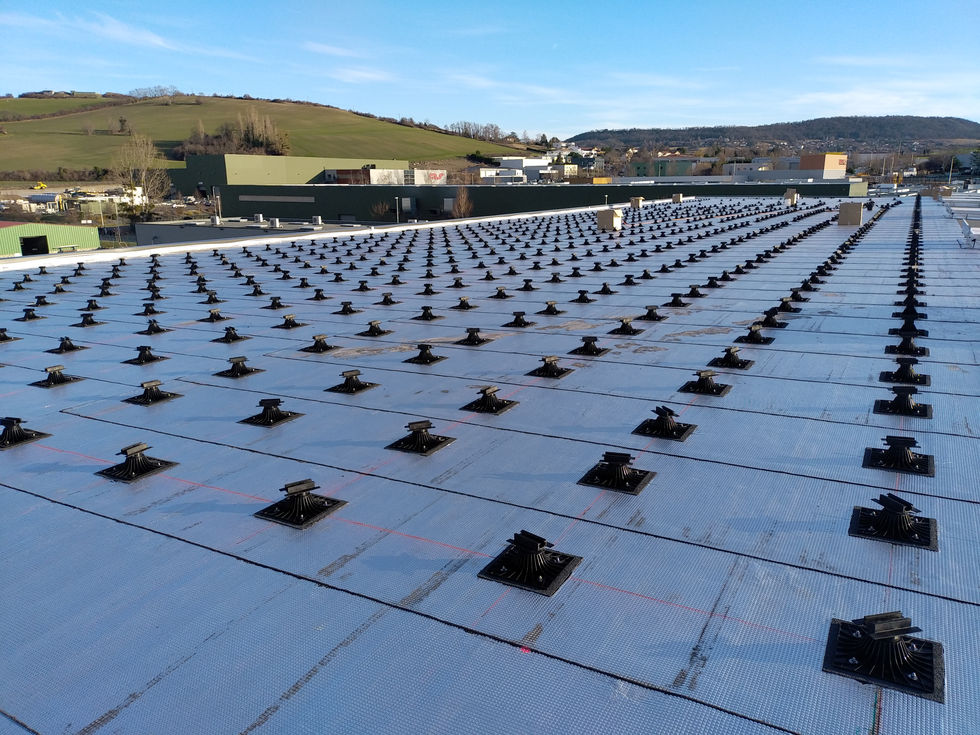 Mise en œuvre d'un millier de plots SOPRASOLAR support de panneaux photovoltaïques.
